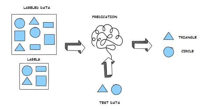 That’s supervised learning—you learn from examples that already have answers (labels), and then you try to guess the answer for new stuff.